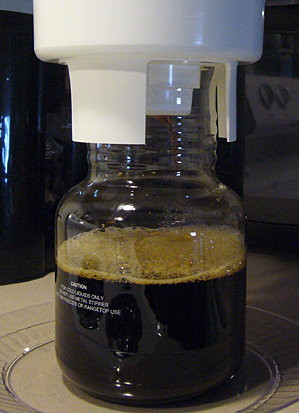 - Finally, after steeping phase is done, place the brewing container on the glass decanter. Remove the cork and allow the coffee to flow into the glass.